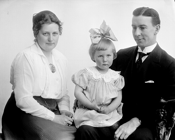 Familiegruppe, 1, kvinne, lys bluse, mørkt skjørt, brosje, sittende, 2, jente, lys kjole med lysere krage, lys hårsløyfe, sittende på fars kne, 3, mann, mørk dress, sittende, alle halvfigur