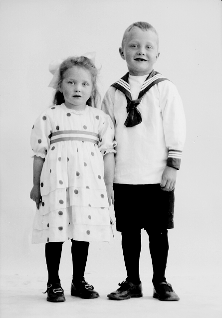 To barn, søsken, 1, jente, lys kjole med mørke bomber, lys hårsløyfe, 2, gutt, lys matrosbluse, mørke knebukser, begge stående, helfigur