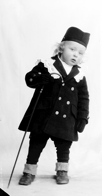 Liten gutt, mørk jakke og lue, stokk i høyre hånd, stående, helfigur