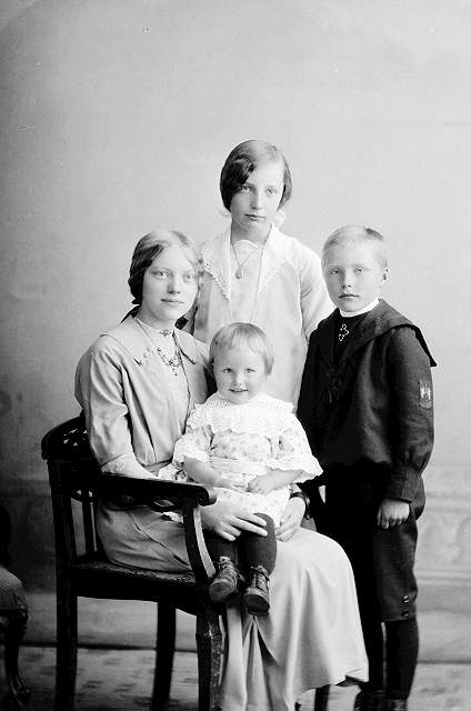 Familiegruppe, fire søsken, 1, jente, lys kjole, sittende på stol, helfigur, 2, lite barn, lys mønstret kjole, sittende på 1s fang, helfigur, 3, jente, lys kjole, stående, halvfigur, 4, gutt, mørk matrosdress, stående, helfigur