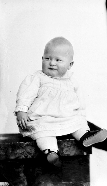 Liten gutt, lys kjole, sittende, helfigur