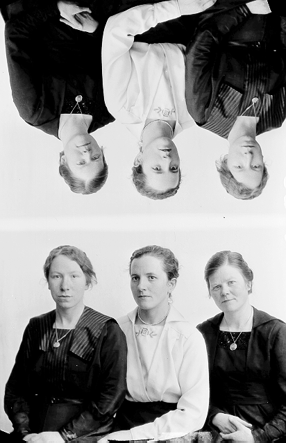 Tre kvinner, 1, mørk bluse og skjørt, 2, lys bluse, mørkt skjørt, perlekjede, (AaO), 3, mørk kjole, alle sittende, halvfigur