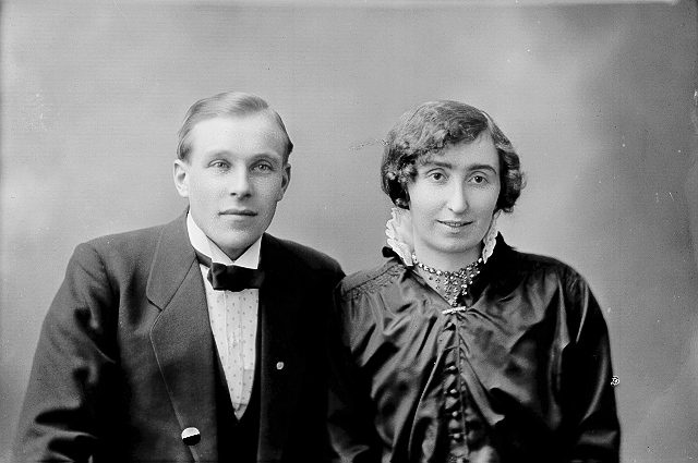 Par, 1, mann, mørk dress, 2, kvinne, mørk bluse, begge halvfigur