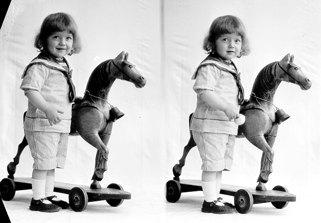 Liten gutt, smalstripet matrosdress, stående ved lekehest, helfigur