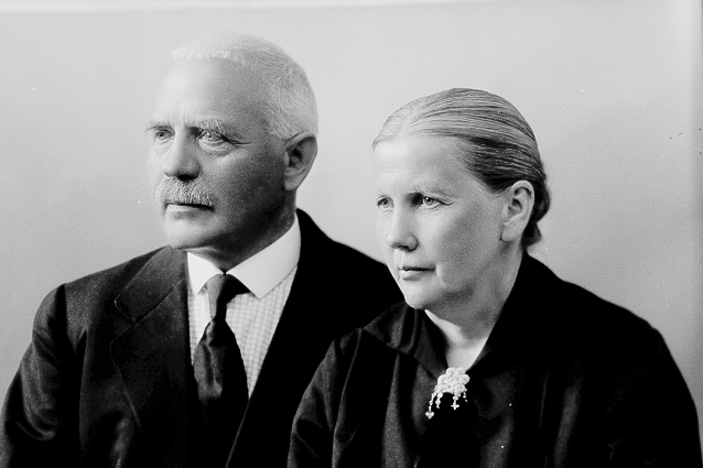 Par, 1, mann, bart, mørk dress, 2, kvinne, mørk bluse, begge halvfigur
