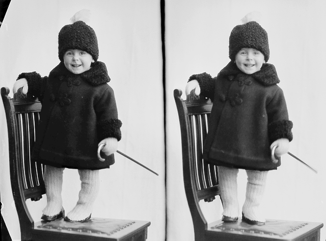 Liten gutt, mørk kåpe og lue, stående på stol, helfigur