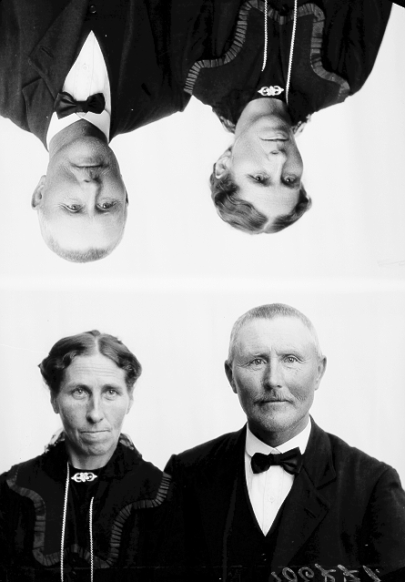 Par, 1, kvinne, mørk bluse, 2, mann, bart, mørk dress, begge halvfigur