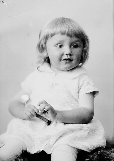 Liten jente, lys kjole, sittende på skinnfell, halvfigur