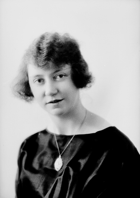 Kvinne, mørk bluse, medaljong i halskjede, halvfigur