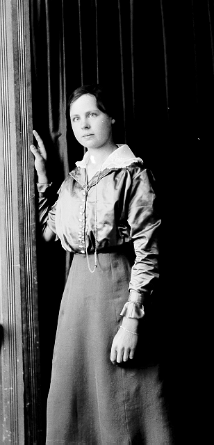 Grå bluse med mørk krage, grått skjørt, stående, halvfigur