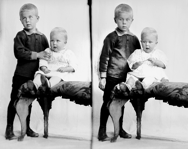 Søskenpar, to gutter, 1, mørk trøye og bukse, stående, 2, lys kjole med pyntebånd, sittende på divan, begge helfigur