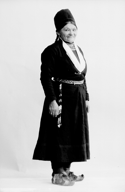 Kvinne, mørk sørsamisk drakt, kommager, stående, helfigur