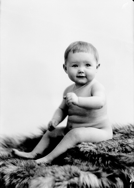Liten jente, naken, sittende på skinnfell, helfigur