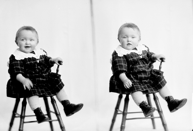 Liten jente, mørk rutete kjole med lys krage, sittende på stol, helfigur