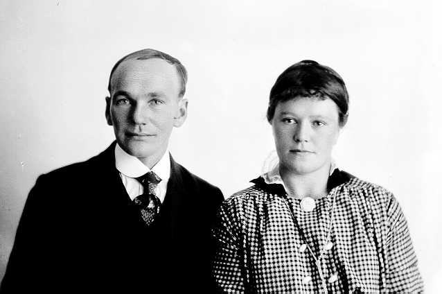 Par, 1, mann, mørk dress, 2, kvinne, smårutet bluse, brosje, begge halvfigur