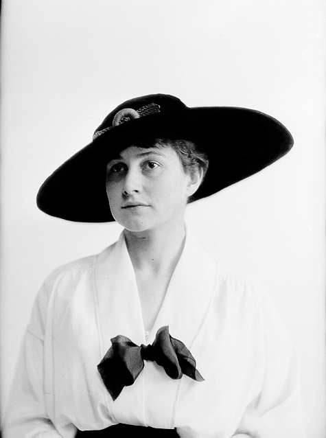 Kvinne, lys bluse med mørk sløyfe, mørkt skjørt, mørk bredbremmet hatt, halvfigur