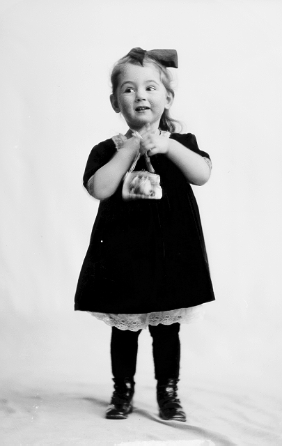 Jente, mørk kjole og hårsløyfe, håndveske i hendene, stående, helfigur