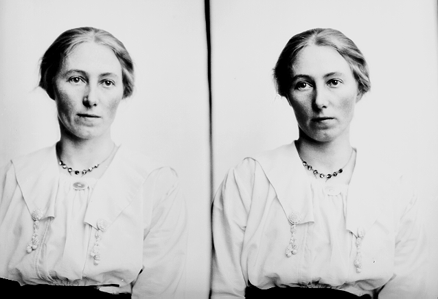 Kvinne, lys bluse, brosje, halvfigur
