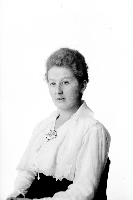 Kvinne, lys bluse, mørkt skjørt, brosje, halvfigur