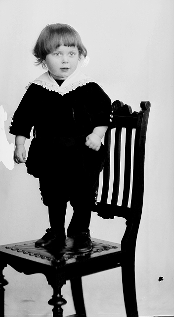 Liten gutt, mørk drakt, stående på stol, helfigur