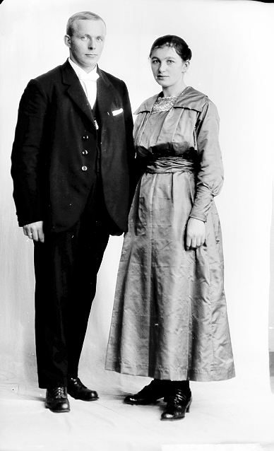 Par, 1, mann, mørk dress, 2, kvinne, grå kjole, begge stående, helfigur