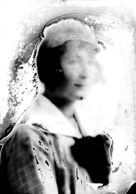 Kvinne, grå bluse med lys krage og mørk sløyfe, halvfigur