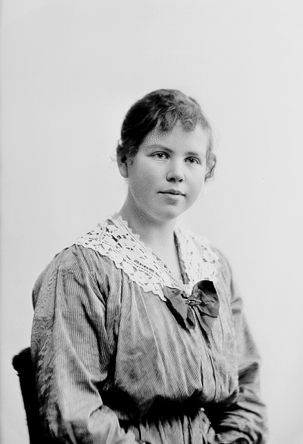 Ung kvinne, grå kjole med lys krage, halvfigur