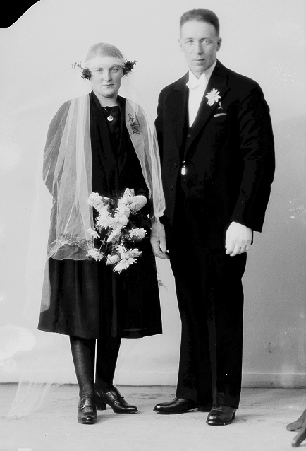 Brudebilde, 1, kvinne, mørk kjole, lyst slør, brudebukett, 2, mann, mørk dress, begge stående, helfigur