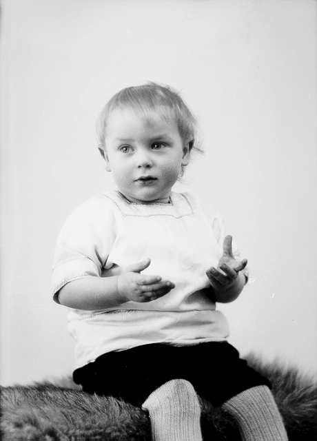 Liten gutt, lys kortermet trøye, mørk kortbukse, sittende på skinnfell, halvfigur