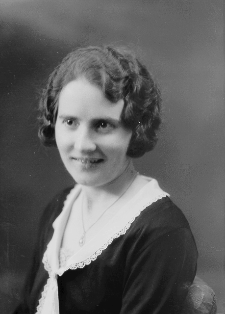 Kvinne, mørk bluse med lys krage, halvfigur