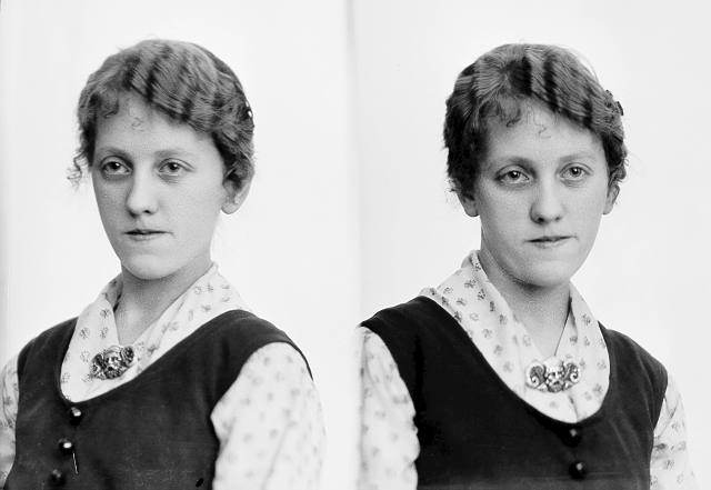 Kvinne, lys mønstret bluse, mørk ermeløs kjole, brosje, halvfigur