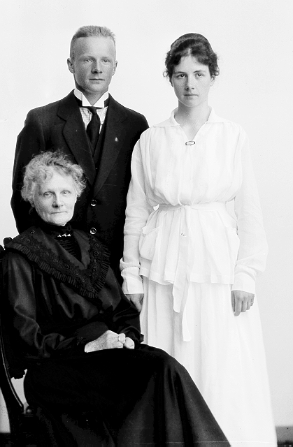 Familiegruppe, 1, kvinne, mørk kjole sittende på stol, (MAa), 2, ung mann, mørk dress, stående, (IAa), 3, ung kvinne, lys kjole, brosje, stående, (SAa), alle halvfigur