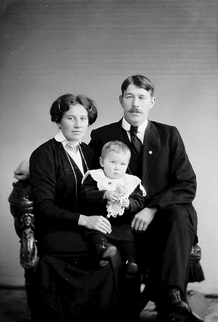Familiegruppe, 1, kvinne, mørk kjole, sittende, halvfigur, 2, liten gutt, mørk kjole med lys krage, sittende på mors fang, helfigur, 3, mann, bart, mørk dress, sittende, halvfigur, (IAa)