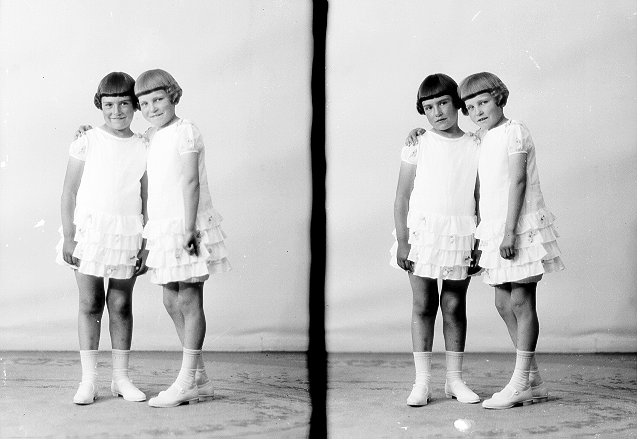 Søskenpar, to jenter, lyse kjoler, stående, helfigur