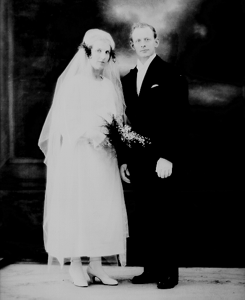 Brudebilde, 1, kvinne, lys kjole og slør, brudebukett, 2, mann, mørk dress, begge stående, helfigur