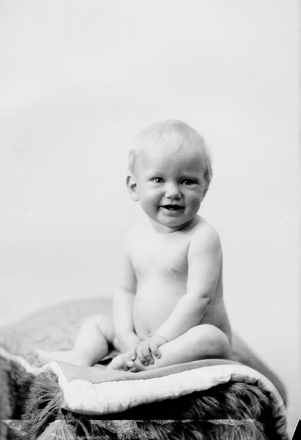 Liten gutt, naken, sittende på kne på teppe på skinnfell, helfigur