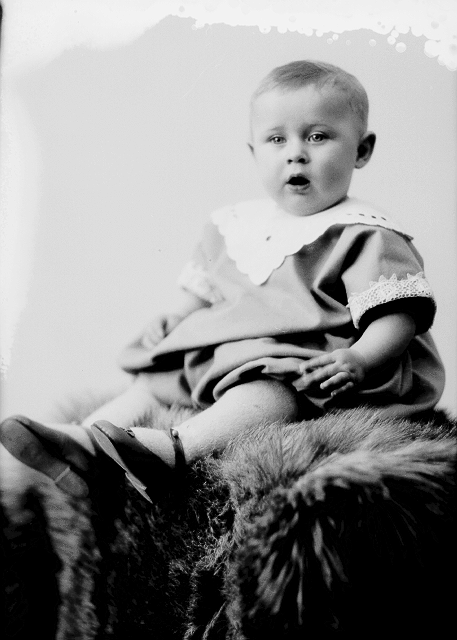 Liten gutt, grå kjole med lys krage, sittende på skinnfell, helfigur