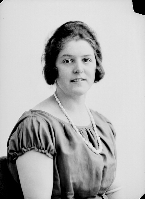 Ung kvinne, grå kjole, halvfigur