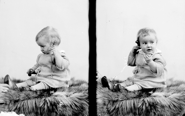 Liten jente, grå kjole, sittende på skinnfell, helfigur