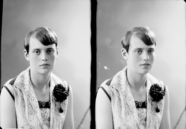 Ung kvinne, lys mønstret ermeløs kjole, blomst på venstre skulder, halvfigur