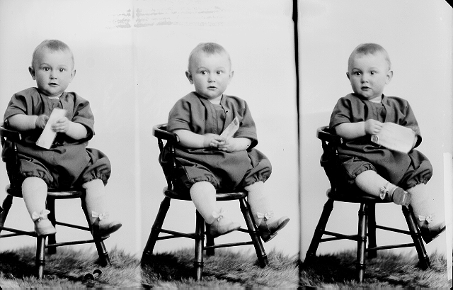 Liten gutt, mørk drakt, sittende på stol, helfgiur