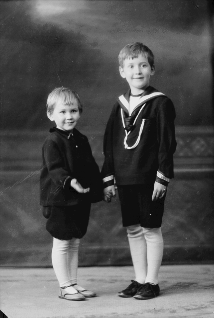Søskenpar, to brødre, 1, mørk jakke og kortbukse, (BB), 2, mørk matrosdress, (NB), begge stående, helfigur
