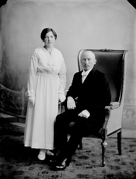 Par, 1, kvinne, lys kjole, stående, 2, mann, bart, mørk dress, sittende i stol, begge helfigur