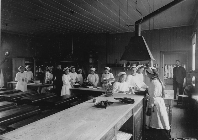 Fra et klasserom i Ila skole, bygningen fra 1877, folkeskole / barneskole på hjørnet av Østre Ila og Mellomila. Bildet viser skolekjøkkenet med elever i arbeid med å lage mat. En lærerinne og en lærer eller skolebestyrer.