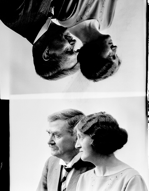 Par, 1, mann, bart, grå dress, 2, kvinne, grå kjole, begge halvfigur, profil