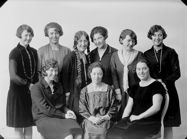 Familiegruppe, ni søstre, tre sittende foran, seks stående bak, alle halvfigur