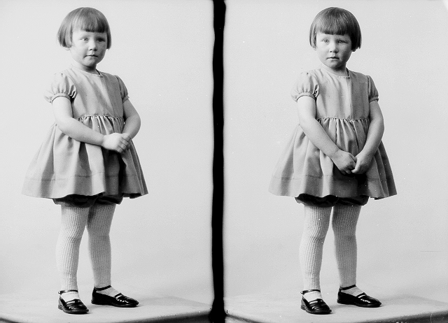 Jente, grå kjole, stående, helfigur