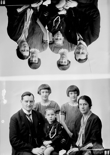 Familiegruppe, 1, mann, mørk dress, sittende, (JØD), 2,4, jenter, grå kjoler, stående, 3, gutt, mørk matrosdress, sittende på fars fang, (GJFD), 5, kvinne, mørk kjole, sittende, alle halvfigur