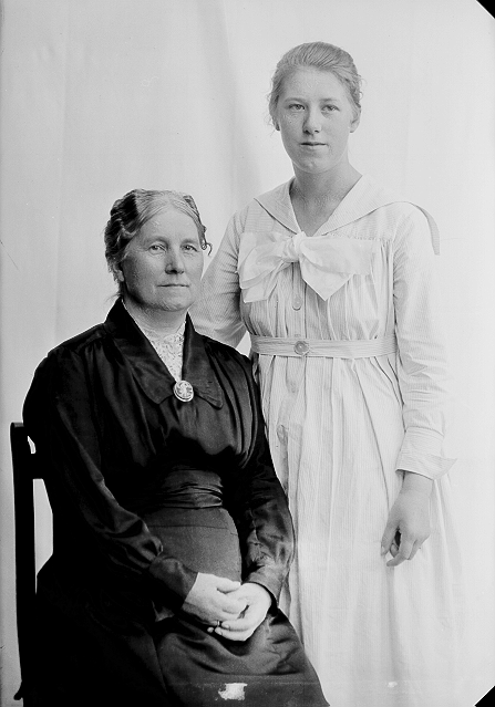 Mor og datter, 1, kvinne, mørk kjole, brosje, sittende på stol, 2, ung kvinne, lys kjole, stående, begge halvfigur