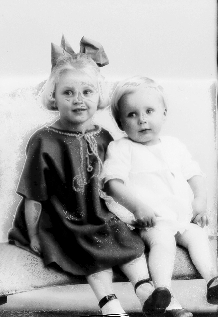 Søskenpar, 1, jente, mørk kjole og hårsløyfe, (LE), 2, liten jente, lys kjole, (BE), begge sittende, helfigur